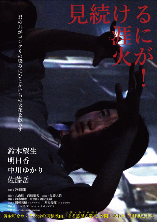 かつてこの街にいて、もういなくなった娼婦たちの存在を 内側から語り直すための風景・言葉・身体のレッスン。夜 の映画館に忍び込んだ4人は外から聞こえてくる声に導かれて身体を動かし始める。新聞やルポ記事がスキャンダラスに「ちょんの間」を書くのとは別のやり方で、⻩金町の風 景の中にたしかにあった時間や存在に近づくには?テキストに対して俳優それぞれが振付を作成した。国際ダンス映画祭2021ノミネート。