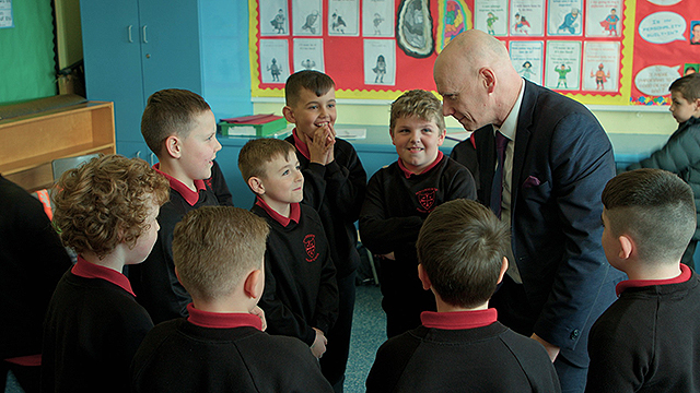 ベルファスト市北部、アードイン地区の中心地に位置するカトリック系の小学校。4歳から11歳までの男子が通う。密集する労働者階級の住宅街に北アイルランドの宗派闘争の傷跡が残るこの地域は混沌とした衰退地区であり、リパブリカンとユニオニスト(注1)の政治的対立により、地域の発展が遅れている。犯罪や薬物乱用が盛んなこの街の絶望感は、ヨーロッパで最も高い青年や少年の自殺率に反映されている。学校を囲む高い壁には鉄条網が張られ、壁には政治的な落書きや壁画が描かれている。2001年には姉妹校のホーリークロス女子小学校の子どもたちが地元のロイヤリストに通学路で脅迫される事件が起き、世界中のメディアで報道された。この事件によって、ホーリークロス男子小学校の教師も殺害予告を受けることとなった。