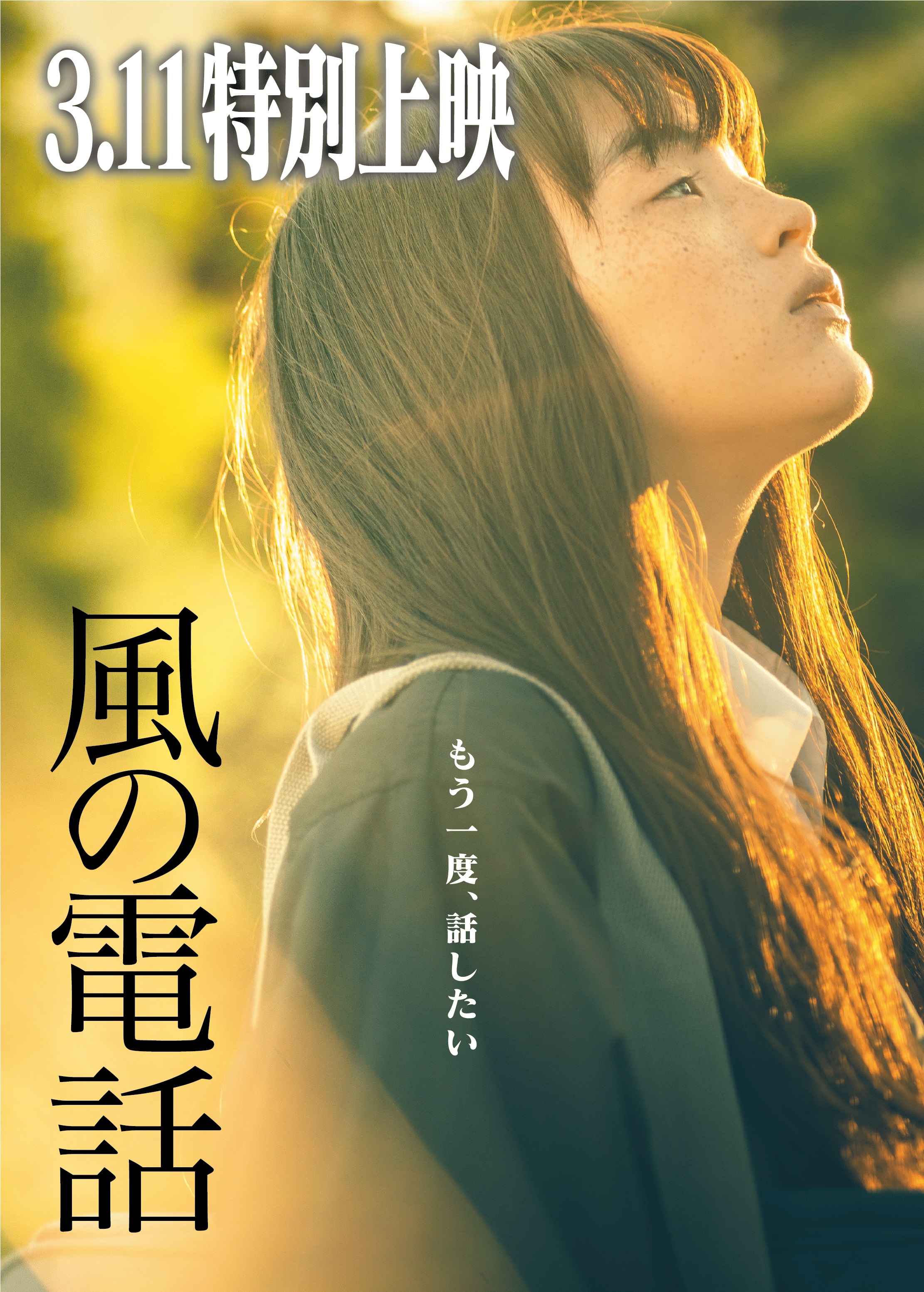 「ライオンは今夜死ぬ」の諏訪敦彦監督が、震災で家族を失った少女の再生の旅を描いた人間ドラマ。今は亡き大切な人と思いを繋ぐ電話として、岩手県大槌町に実在する「風の電話」をモチーフに映画化した。8年前の東日本大震災で家族を失い、広島の叔母のもとで暮らす17歳の少女ハル。ある日、叔母が突然倒れ、自分の周りの人が誰もいなくなってしまう不安にかられた彼女は、震災以来一度も帰っていなかった故郷・大槌町へ向かう。豪雨被害にあった広島で年老いた母と暮らす公平や、かつての福島の景色に思いを馳せる今田ら様々な人たちとの交流を通し、ハルは次第に光を取り戻していく。道中で出会った福島の元原発作業員・森尾とともに旅を続けるハルは、「もう一度、話したい」という強い思いに導かれ、故郷にある「風の電話」にたどり着く。主人公ハルを「少女邂逅」のモトーラ世理奈、森尾を西島秀俊が演じる。第70回ベルリン国際映画祭ジェネレーション14プラス部門に出品され、スペシャル・メンション(国際審査員特別賞)を贈られた。
