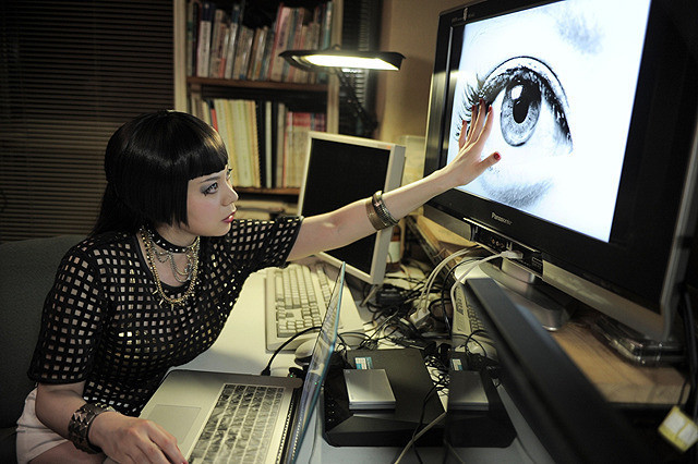 精神崩壊をも辞さぬ体当たりの狂演でヒロイン・城所麻耶を体現したのは、ミュージカル界出身で映画初主演の万里紗。ボディラインを強調したセクシーなレザースーツを身に纏い、一眼レフカメラを片手に息を荒げながら眼球を激写する一方で、肉感的な裸体を惜しげもなく披露する。また麻耶のよき理解者であり、怪しい関係を匂わすゴス娘・紙谷リエを、佐藤寿保監督作『華魂』に主演した桜木梨奈が安定の存在感で務める。